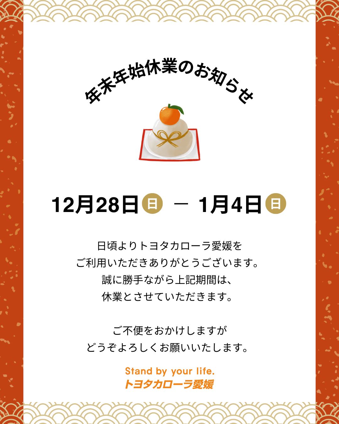 年末年始休業のお知らせ 2025/12/12 最新情報 万が一の事故や故障の際には下記リンクよりご相談ください。 https://corolla-ehime.jp/specialbusiness/jaf/ 一覧に戻る