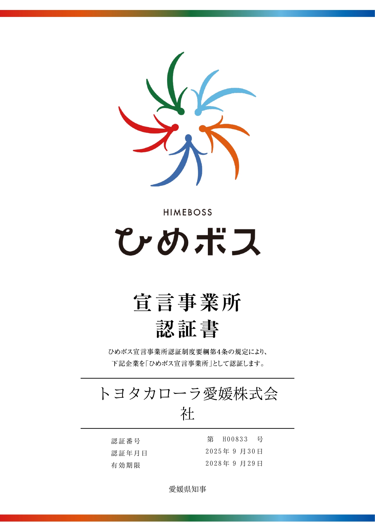 このたび、9月30日に愛媛県の「ひめボス宣言事業所」として認証されました。